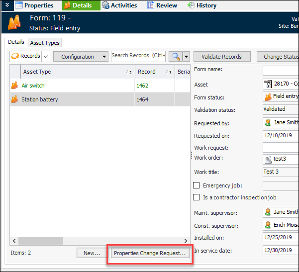 You can now create an asset properties type of change request from the Details view and tab of a validated construction form. Select the record and click Properties Change Request.The New Properties Change Request window opens with many of the construction form properties defaulted in. For more information, see Creating Asset Properties Change Requests.Construction Management