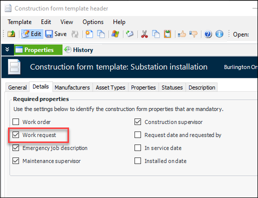 You can now make it mandatory for users to identify the interop work request on construction forms. In the Construction Form Template Header window, select the Details tab and then Work request. For example:In the Construction Form window, you can browse for interop work requests in the Properties and Details views. For example:Specifying Parents for Construction Form Detail Assets