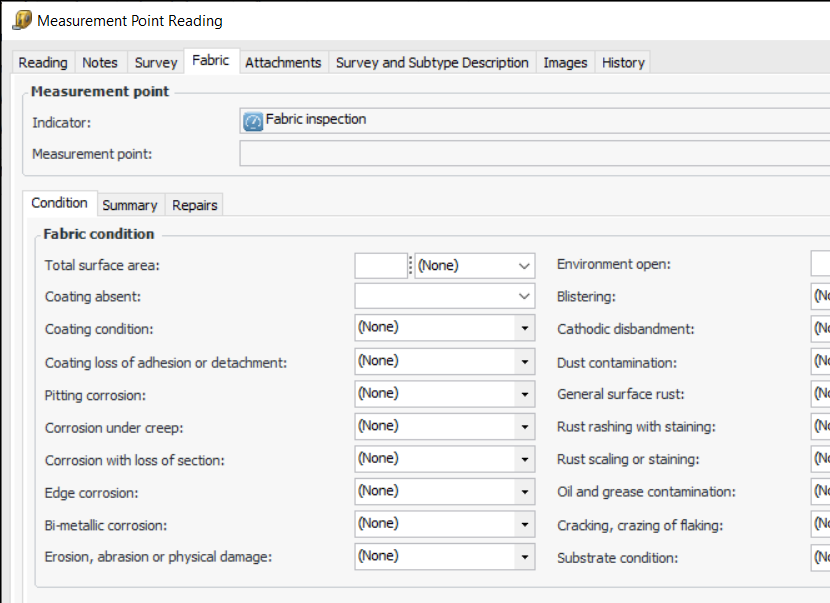 This release introduces the Fabric indicator subtype for measurement point readings. When the subtype is assigned to an indicator type, measurement point readings for indicators of that type display the Fabric tab. For example:Note: The Fabric inspection subtype is available for technology preview. You must first enable feature 95 to use the functionality in APM. In the Enterprise window, select the Features view and the Enabled Features tab. Click Browse, select “Support for Fabric Inspection subtype on Measurement Point Reading” and click OK. If APM is running as a smart client, click Refresh Enabled Features on the server. Then restart the client to use the functionality.Information about fabric inspections is displayed in measurement point reading history for the site. In the site’s Inspection Management view, select the Readings and By Indicator tabs and then the Measurement Points tab.Fluid Sample Tab on Indicator Readings