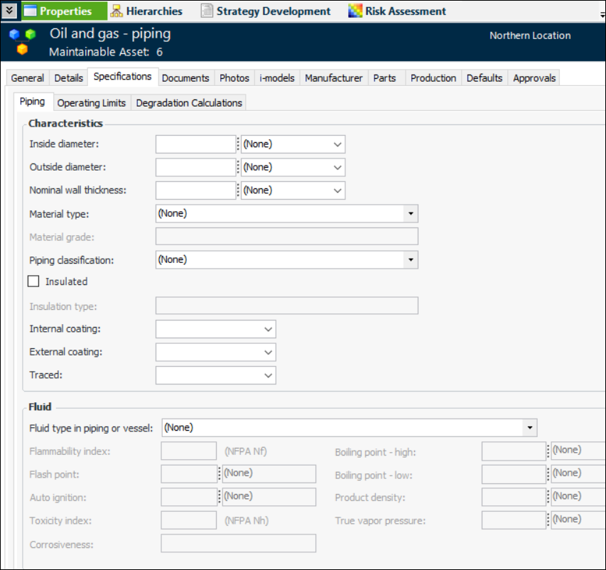 Note: Support for dead leg specifications is a “generally available” product feature. You must first enable feature 96, as well as 91, to use the functionality in APM. In the Enterprise window, select the Features view and the Enabled Features tab. Click Browse, select “Support for Dead Leg Piping section asset specifications” and click OK. If APM is running as a smart client, click Refresh Enabled Features on the server. Then restart the client to use the functionality.To use the specification, add it to an asset type and select the panel “Asset specifications - Oil and Gas - Dead leg piping”. Assets of the type display the Specifications tab on the Asset window, Properties view. For example:Distribution Networks Asset Specifications