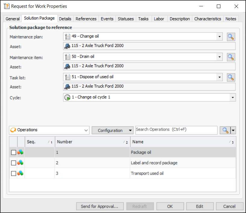 • Solution Package window – Properties view displays tabs listing any subordinate solution packages, steps, and cycles. Windows for interop work requests and work orders now contain Solution Packages tabs that list the items at each level.Next Due On Date
