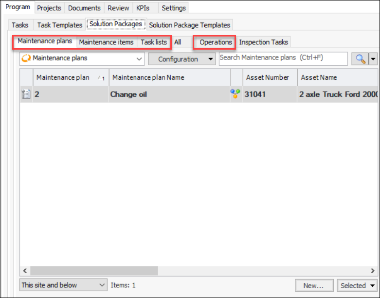 • Site window – Solution packages and templates reflect the solution package levels and steps defined in the site’s interoperability profile. For example, below is a site’s Reliability Program view, Solution Packages tab. The site’s interoperability profile defines three solution package levels: Maintenance plan, Maintenance item, and Task list. Steps have been defined as “Operations” to describe the tasks performed on the solution package.