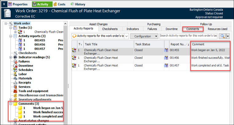 Activity report comments are now displayed in the work order’s Activity view. For example:In the Work Order window, Activity view, comments are displayed under the Comments node in the Work Order tree and in the Comment column in the Activity Reports tab.