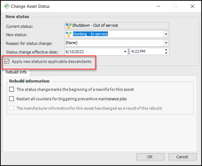 Apply new status to applicable descendants is selected by default. You can clear this option to prevent the change to child assets.To change the default selection in the Change Asset Status dialog, clear the Apply new status to descendants option in asset statuses:Note: The option to not apply the status to descendants is generally available. You must first enable feature 106 to use the functionality in APM. In the Enterprise window, select the Features view and the Enabled Features tab. Click Browse, select “Provide an option to limit an asset status change to the current asset only” and click OK. If APM is running as a smart client, click Refresh Enabled Features on the server. Then restart the client to use the functionality.Asset Category and Class of Asset – New Asset Properties