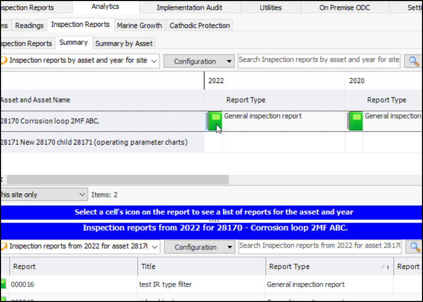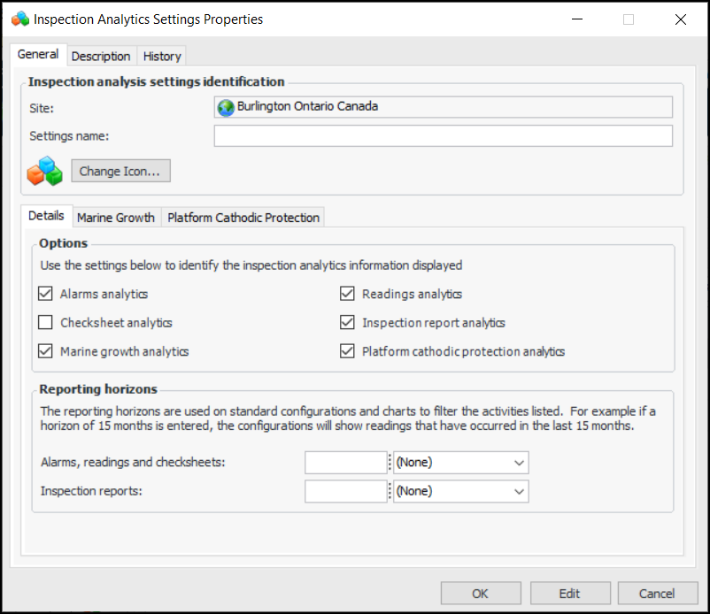 • The Inspection Reports tab provides charts showing inspection reports by time period and status for the current site. Select the Summary or Summary by Asset tab to view specific assets’ reports. Click a report’s icon to list reports for the asset and year. For example:To select the data to show and the time profile, select the Inspection Management view, Settings tab, Indicators tab, and then the Analytics tab. Click New to open the Inspection Analytics Settings dialog:You can name the settings, select the appropriate tabs to be displayed, and set the reporting horizons. After saving the settings, enable editing for the site, and select the new settings in the Analytics settings to use list:Marine Growth Analytics Chart