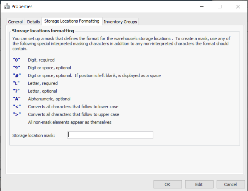 You can now define formatting rules for the names of warehouse storage locations. In the warehouse Properties dialog, select the Storage Locations Formatting tab to set up a mask:For related information, see **Setting up Warehouses, Adding an Item to a Warehouse, Entering and Processing Inventory Count Results, and Adjusting Inventory.Online Data Collection (ODC)