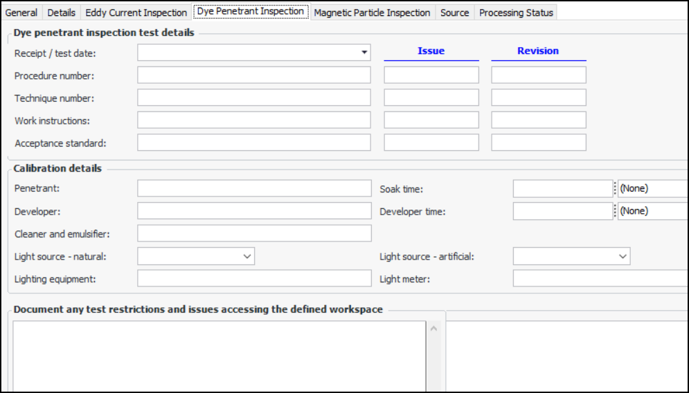 When a subtype is assigned to a checksheet type, checksheets of that type have the option of displaying an Inspection tab in the Properties view. Here is an example of the Dye Penetrant Inspection tab:Measurement Point Reading – Reference to Previous Reading