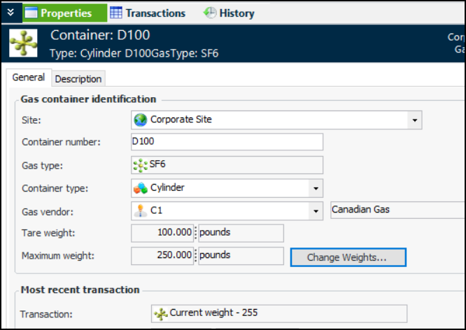 To mark a transaction as incorrect, locate the transaction in a table, for example, transactions By Container. Right-click the transaction and click Mark as Incorrect. (The option is only available for the container’s most recent transaction.) The Mark Gas Transaction as Incorrect dialog appears:Once the transaction is marked incorrect, you cannot change any of its properties. It is displayed as scored through in tables. In the Gas Transaction window, select the Incorrect Transaction Info tab to view the reason, comment, and so on.You can set up reasons for marking transactions as incorrect. In the Site window, select the Regulated Gas Management view and the Settings tab. Select the Incorrect Transaction Reasons tab and click New.Change Gas Container Maximum Weight