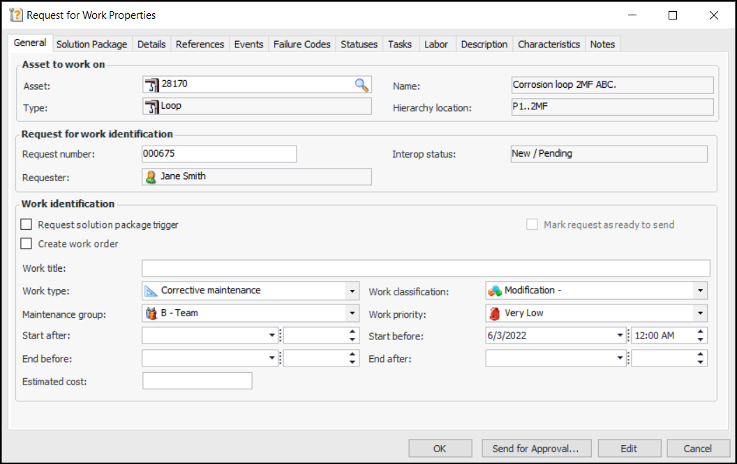 When AWEIS is active, you can create one or more requests for work from an indicator checksheet in APM or APM Remote. In the Checksheet window, select the Readings view and the Requests for Work tab. Click New to open the Request for Work Properties window. For example:Configuring the APM Environment