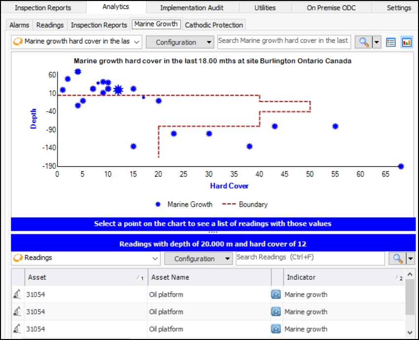 You can use the new “Dashboard - Indicator Analytics Marine Growth” site panel in the Analytics tab and other dashboards to display a point style chart of measurement point readings with the marine growth subtype. Depth and Hard Cover are the chart co-ordinates.You can also set up a boundary line to highlight readings outside of normal points. Define the chart line in the Charts tab and add it in the Inspection Analytics Settings dialog, Marine Growth tab:Cathodic Protection Analytics Chart
