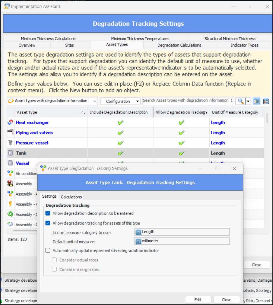 For more complex objects, such as sites, asset types, indicator types, alarm types, approval routes, and so on, the tabs display only information that is specific to the function being implemented. For example, in the Strategy Development Analysis Settings assistant, the Employees tab lists employees, shows their sites, and indicates the types of analyses they are allowed to update: