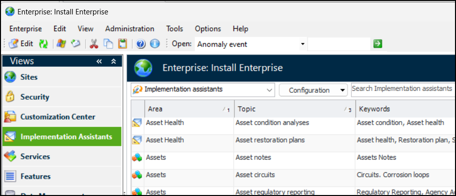 Double-click an assistant to open its window. The Overview tab provides a list of setup tasks, as well as links to related topics in APM Help. For example: