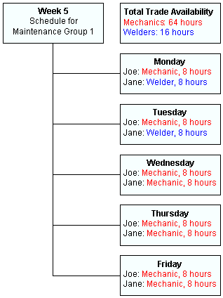 • Availability: The number of person-hours, trade-hours, or resource-hours available on the schedule. Depending on which level of data you are reviewing, this is either the total number of hours available for all employees, for the employees of a trade, or for an individual employee. For example, you have 3 employees available to the schedule, two mechanics for 30 hours each (Jane and Jim), and one machinist for 20 hours (Joe). The total availability is 80 hours, the mechanic trade availability is 60 hours, and Joe’s employee availability is 20 hours.