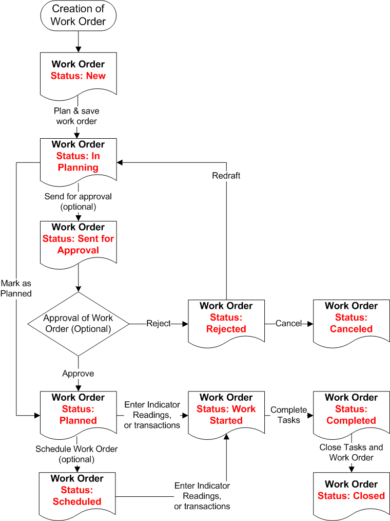 • When all of the work order’s tasks are scheduled, the work order also has this status. When the first indicator reading is entered or a labor or service transaction is charged to a work order task.Statuses and the Work Order Life Cycle