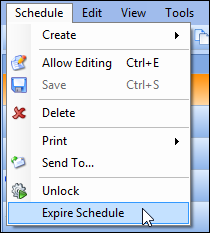 Expired schedules are not deleted automatically unless that option is selected in the schedule’s properties. In order for schedules to be automatically expired, the Expire Schedules action must be run for the site. You can run this action from the site’s Tools menu, Work Management option, or your system administrator can schedule this action to run on a regular basis.To Manually Expire a Schedule