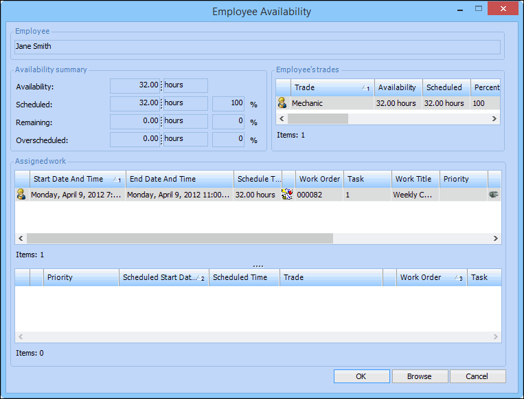 7. To work with employee availability, from the Worksheet view, double-click the bar for that employee on the Employee Availability summary chart. The Employee Availability dialog appears. For example: