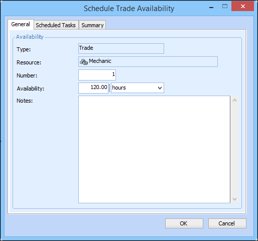 • Availability: The number of person-hours, trade-hours, or resource-hours available on the schedule. Depending on which level of data you are reviewing, this is either the total number of hours available for all employees, for the employees of a trade, or for an individual employee. For example, you have 3 employees available to the schedule, two mechanics for 30 hours each (Jane and Jim), and one machinist for 20 hours (Joe). The total availability is 80 hours, the mechanic trade availability is 60 hours, and Joe’s employee availability is 20 hours.
