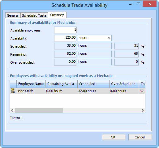 • Employees: The total number of employees who are available to the schedule or to the trade. Use the number of employees as a guideline only, in combination with the hours available for each trade and employee. For example, the schedule might say that you have 2 employees available: Joe and Jane. If Jane is available full-time but Joe is only available half-days, you can only schedule work for 1.5 full-time employees.