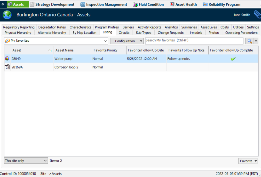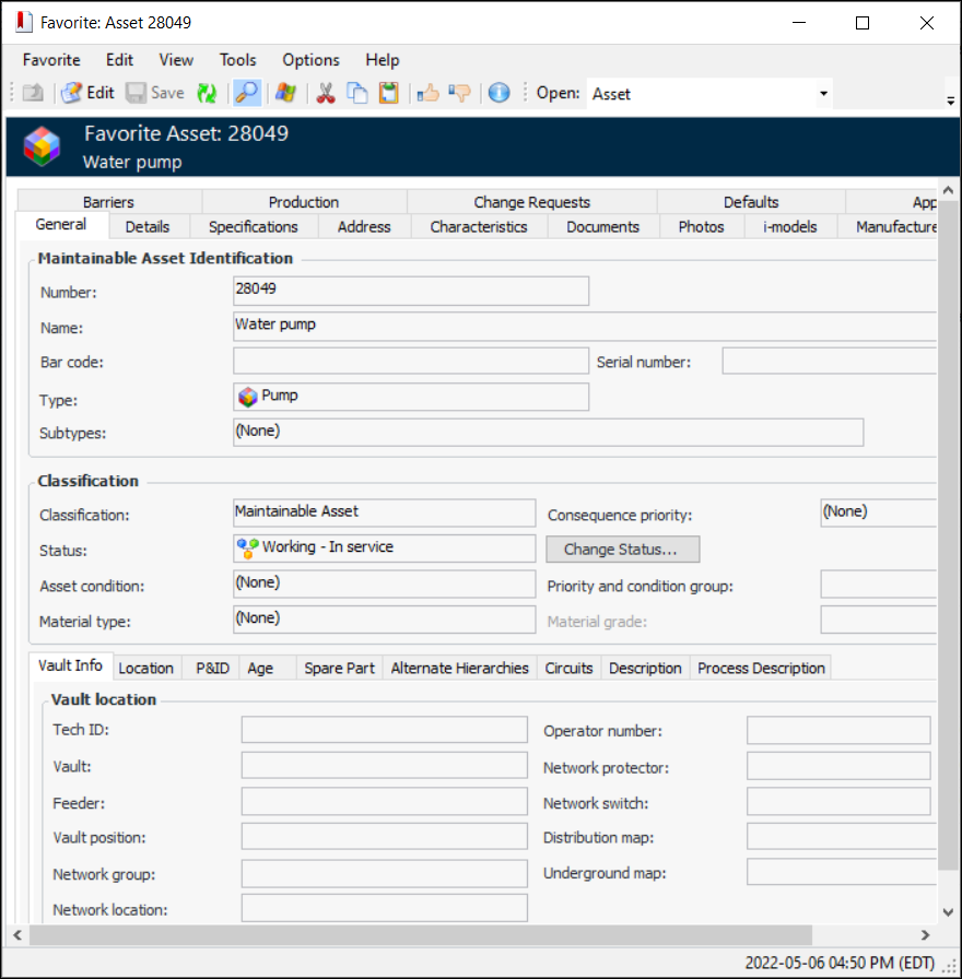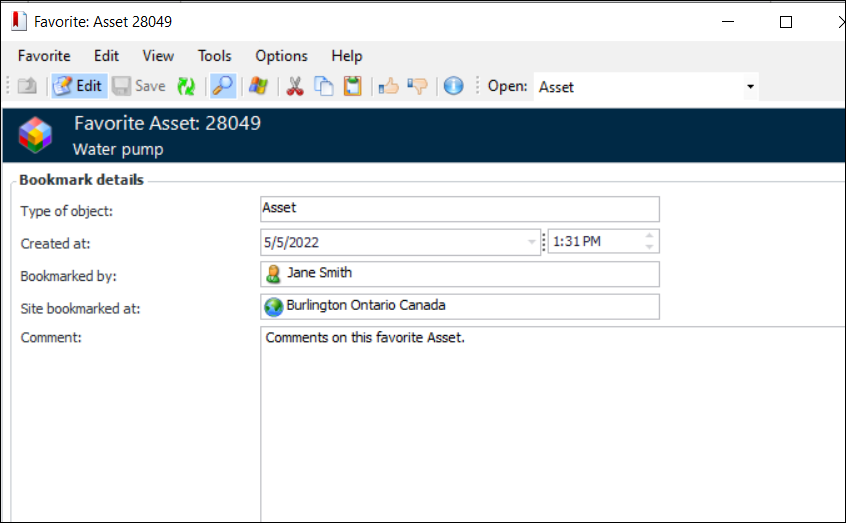 1. From the Favorites view or a My Favorites table, double-click the favorite you want to open. The Favorite window appears. Here is an example for an asset: