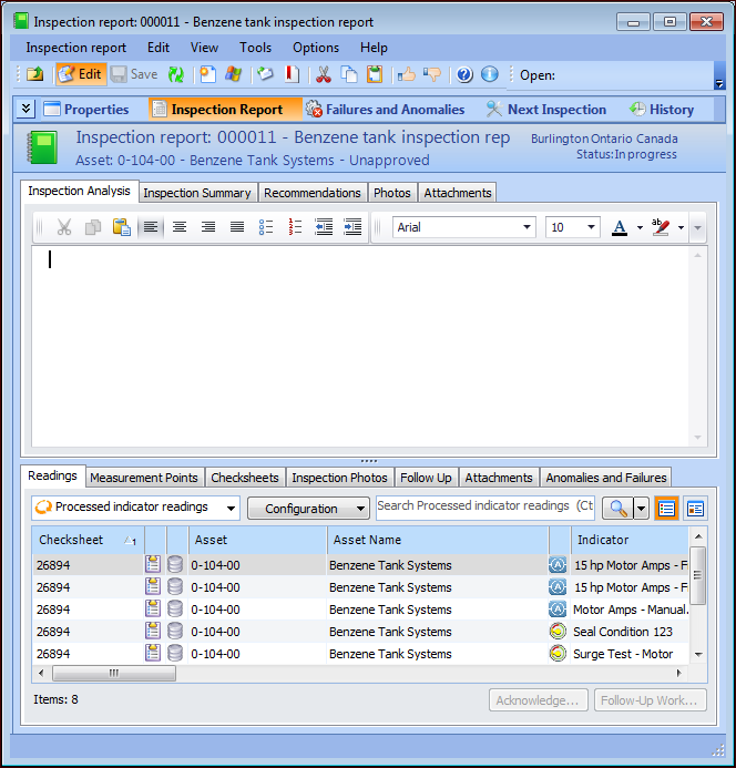 2. Use the Inspection Analysis tab to record your review of the assets’ indicator readings and degradation history. Refer to the tabs below, which list the readings, follow-up actions, and information collected during inspection, such as photographs and attachments. Very often, checksheet notes, analyses, summaries, and recommendations are useful to the analysis.