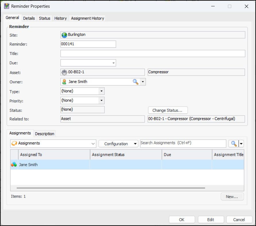 Reminders are tasks and employee assignments that can be added to most objects in APM. Here is an example of the Reminders view in the Asset window:Note: Reminders are a generally available product feature. You must first enable feature 139 to use the functionality in APM. In the Enterprise window, select the Features view and the Enabled Features tab. Click Browse, select “Reminders and assignments” and click OK. If APM is running as a smart client, click Refresh Enabled Features on the server. Then restart the client to use the functionality.To Create a Reminder