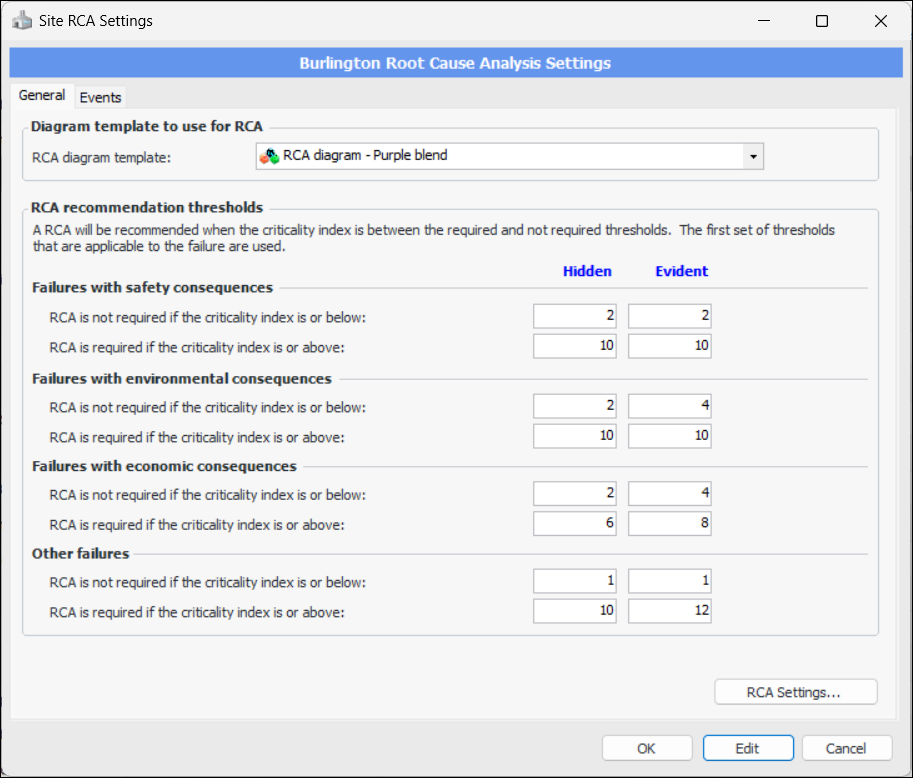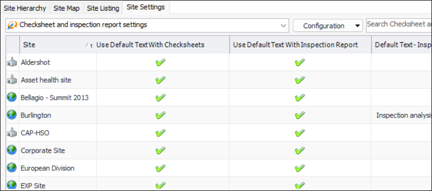 Concepts Settings Working with Site Settings In the Enterprise window, Sites view, Site Settings tab, the Configuration list provides several ways to view and compare settings across sites for the enterprise. You can view: • Asset settings • Indicators and readings settings • Checksheet and inspection report settings • Degradation settings • Acknowledgment settings • Strategy development settings • RCA settings • Performance settings • Interop work settings • EAM work settings • Reminders settings • Accounting settings • Inventory settings • Purchasing settings • Invoicing settings • Integration settings • Object ownership settings • Modules settings • Approval settings Select a configuration to view a list of sites, with each site’s value shown in the setting columns. For example: Each of the configurations has its own dialog. For example: This provides a centralized location to adjust multiple settings.