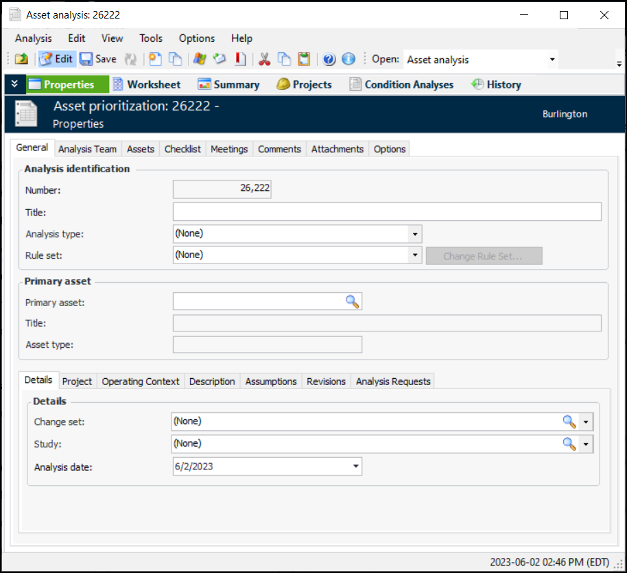 • If AWEIS is active and the analysis includes interop assets, when you apply the results, asset change requests are created and sent to the external CMMS to update equipment consequence priorities. To make this process successful, ensure that an asset change request type has been defined and assigned to the site. See Setting up Asset Change Request Types and Setting up Asset Change Request Statuses.Tip: You can mark an asset prioritization analysis as inactive, which prevents it and its assets from being edited. The Worksheet view is not displayed in the Asset Analysis window of inactive analyses.To Create a Prioritization Analysis