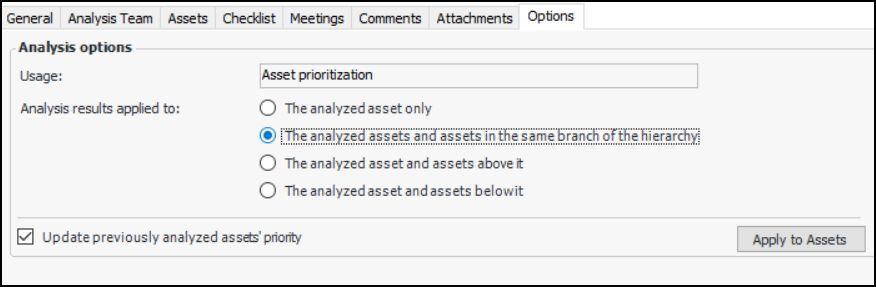 • The analyzed asset only – Only the assets included in the current analysis have their consequence priority numbers or conditions updated