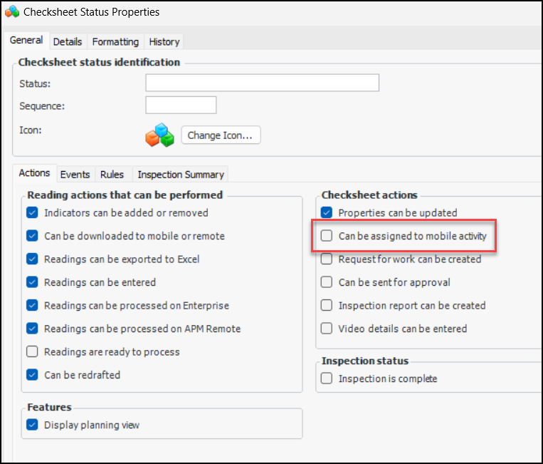 Previously, checksheets were assigned to mobile devices through their sources, for example, standard tasks. You can now assign a checksheet created from scratch to a mobile device. A new option – Can be assigned to mobile activity – on checksheet status enables this functionality:Performance and Stability Enhancements
