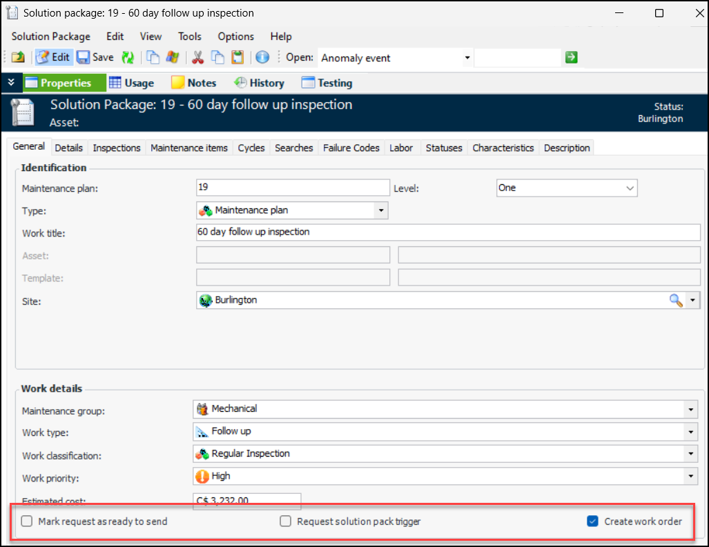 Note: Variable due date calculations is a “generally available” product feature. You must first enable feature 117 to use the functionality in APM. In the Enterprise window, select the Features view and the Enabled Features tab. Click Browse, select “Ability to define standard task due date calculation until inspection is complete” and click OK. If APM is running as a smart client, click Refresh Enabled Features on the server. Then restart the client to use the functionality.To set up due date calculation options, open the Standard Task window, Properties view, Inspection tab, Options tab. For example:Standard Task Due Date Defaulted to its Checksheet Planned Date