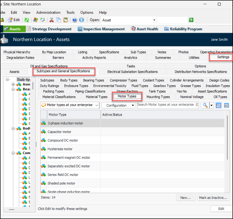 Asset administration dialogs and settings tabs have been reorganized so that value lists are easier to find. For example, to add a new motor type, you no longer need to select the Motors tab and then the Motor Types tab. Instead, the Motor Types tab is visible under the Subtypes and General Specifications tab:AWEIS – Standard Task Due Date Calculation