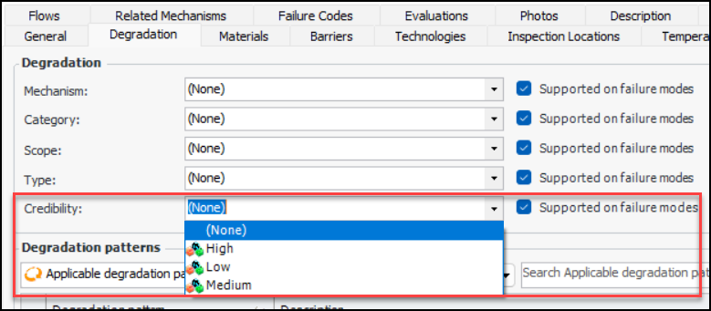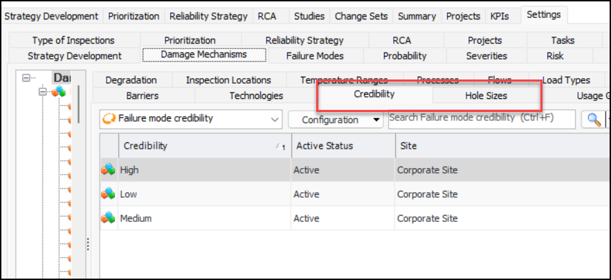 The following properties have been added to damage mechanisms: Hole size, Base probability, and Credibility. To access them, open the Site window, select the Strategy Development view, and the Damage Mechanisms Library tab. Open or create a damage mechanism. Select the Properties view, General tab:When Supported on failure modes is selected (default), the properties are copied to failure modes created from the mechanism.Select the Degradation tab to see the Credibility property:To populate the value lists for Hole size and Credibility, select the Settings tab in the site’s Strategy Development view. Select the Damage Mechanisms tab. The Credibility and Hole Sizes tabs allow you to create or edit values. For example: