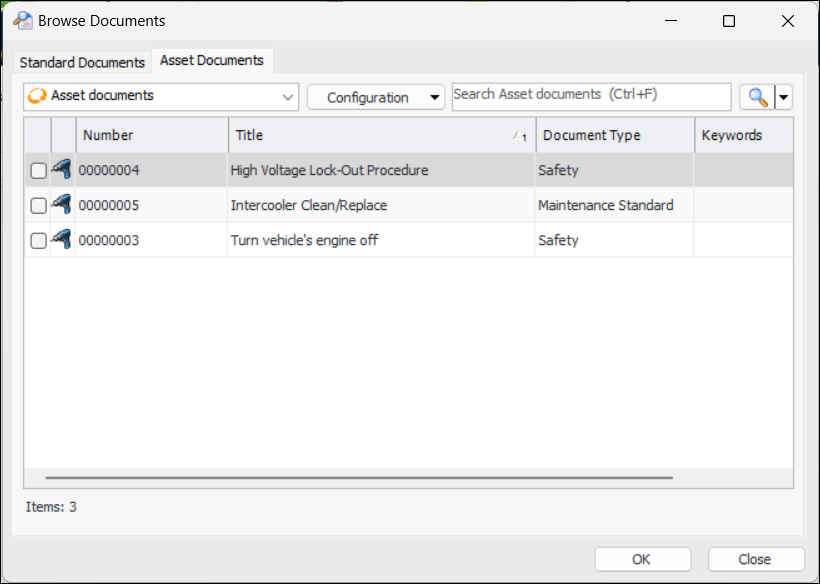 You can browse for documents to add to a checksheet by opening the Checksheet window, selecting the Readings view, selecting the Documentation tab, and then the Documents tab. Click Browse.The Browse Documents dialog now contains both the Standard Documents tab and the Asset Documents tab. This tab lists all of the documents assigned to the asset.Select one or more documents and click OK to add them to the checksheet.Indicator Reading Attachments Shown on Failures