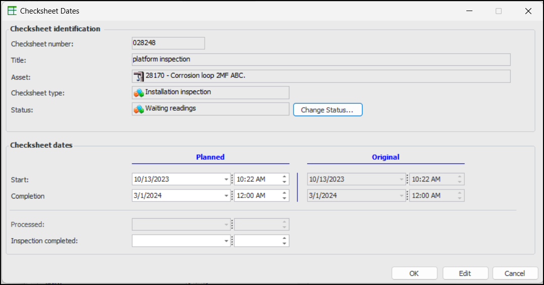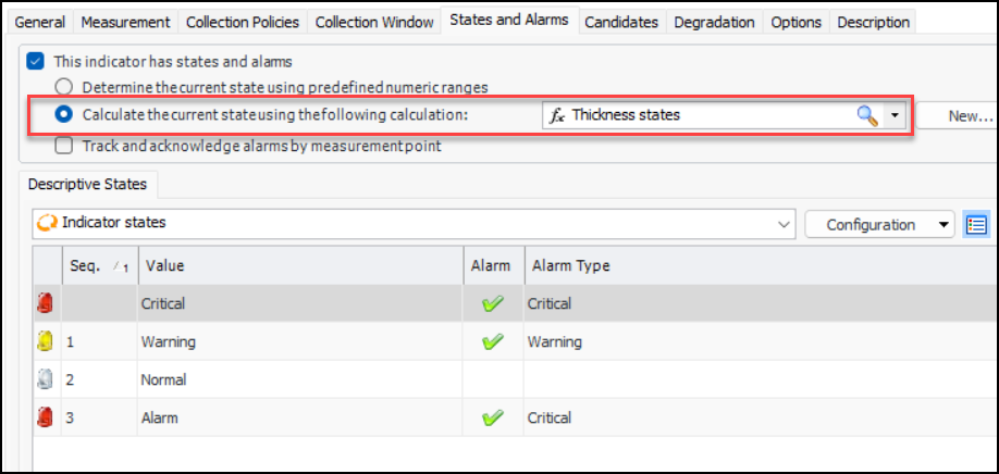You can now assign calculations to indicator states when the indicator supports multiple measurement points. For example, a degradation indicator requires measurement points. On the States and Alarms tab, a calculation has been assigned to determine the states that will be applied to the aggregated readings:Note: Calculations are not supported when Track and acknowledge alarms by measurement point is selected. Measurement point readings must be aggregated to use calculations.Checksheet Original Planned Dates