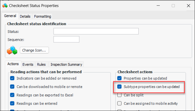 When an indicator alarm is acknowledged and a failure record created, you can now view the indicator reading’s attachments in the Failure Event window, Attachments tab. For example:Checksheet Status – Subtype Properties