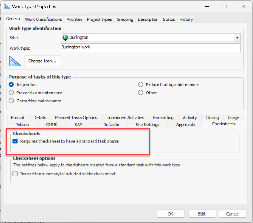 The indicator type controls this behavior. Select the new Failure Mode Review tab to set the options:Limit Work Types Available for Checksheets
