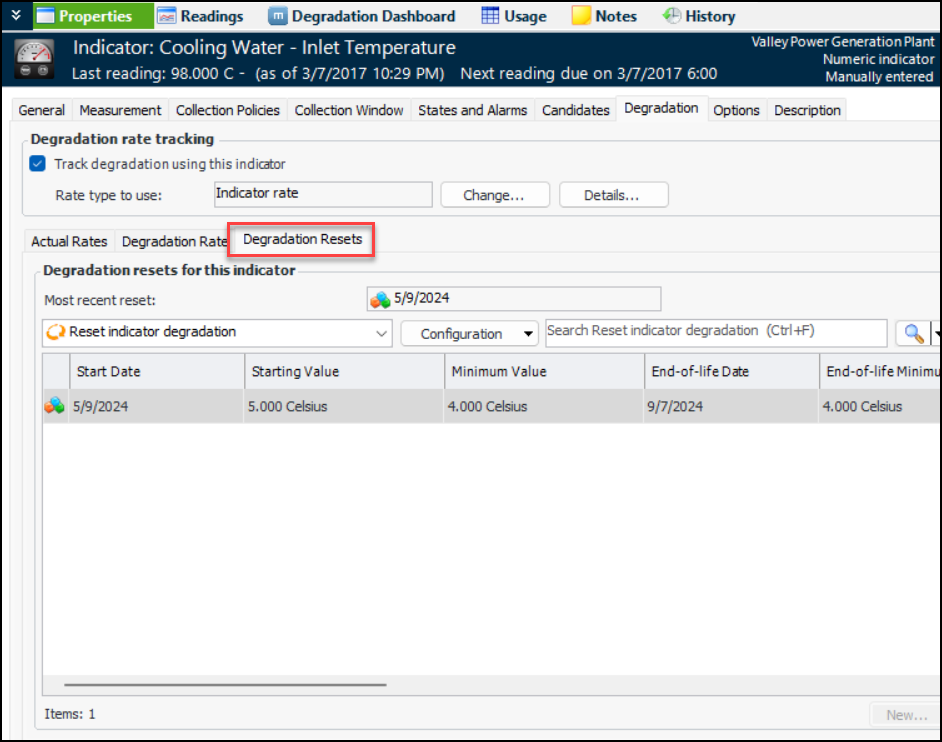 Note: The degradation reset function is available for technology preview. You must first enable feature 126 to use the functionality in APM. In the Enterprise window, select the Features view and the Enabled Features tab. Click Browse, select “Support ability to reset indicator degradation rate when piping replaced” and click OK. If APM is running as a smart client, click Refresh Enabled Features on the server. Then restart the client to use the functionality.To reset degradation tracking, open the Indicator window, click the Tools menu and then Reset Degradation. The Indicator Degradation Rate Reset window displays the current indicator degradation rate and the current date as the new starting date. For example:When the reset is saved, the Degradation Resets tab is added to the Indicator window. For example:In the Degradation Rate tab, you will find the Restarted Indicator Rate tab, as well as the Indicator Rate and Asset Design Rate tabs.Note: When an indicator has been reset, the Change Design Info button is no longer available. You can perform another reset to change design information.You can view resets at the site level by selecting the Inspection Management view, the Indicators tab, and the Degradation Resets tab.Indicator Measurement Points with Calculated States