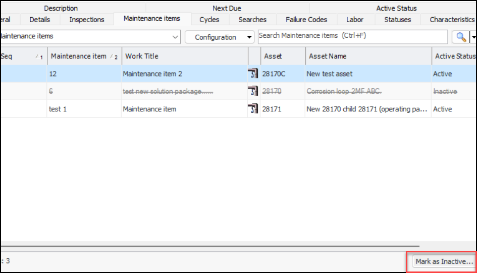 Open the solution package or template and select the tab for the subordinate level, in this example, Maintenance Items. Select an item in the table and click Mark as Inactive. You can provide a comment in the message box that appears. When you click OK, APM confirms that the item is inactive. The inactive package is shown as struck-through in the table. The Active Status column identifies the item as “Inactive”.When you are ready to reactivate the item, select it and click Mark as Active.AWEIS – Work Request and Scheduled Dates on Work Orders
