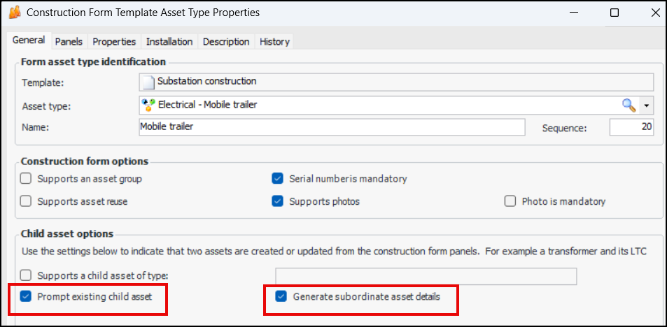 To set this up on a construction form template, open the asset type for the parent asset (for example, Mobile Trailer). In the Child asset options area, select Prompt existing child asset and Generate subordinate asset details.Data Loading – Standard Task
