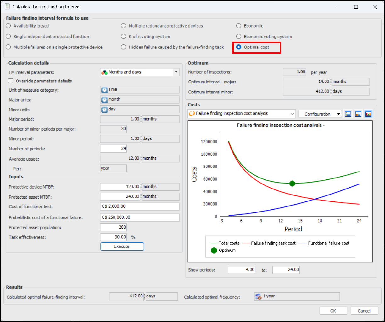 Note: The Optimal cost calculation is a “generally available” product feature. You must first enable feature 141 to use the functionality in APM. In the Enterprise window, select the Features view and the Enabled Features tab. Click Browse, select “Optimal cost calculation for Failure Finding Interval” and click OK. If APM is running as a smart client, click Refresh Enabled Features on the server. Then restart the client to use the functionality.