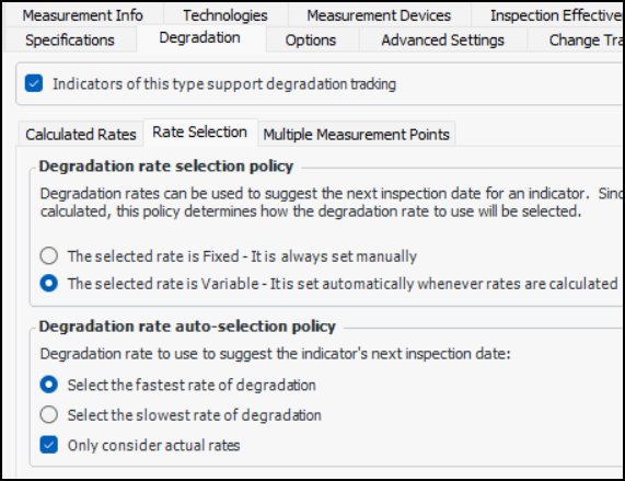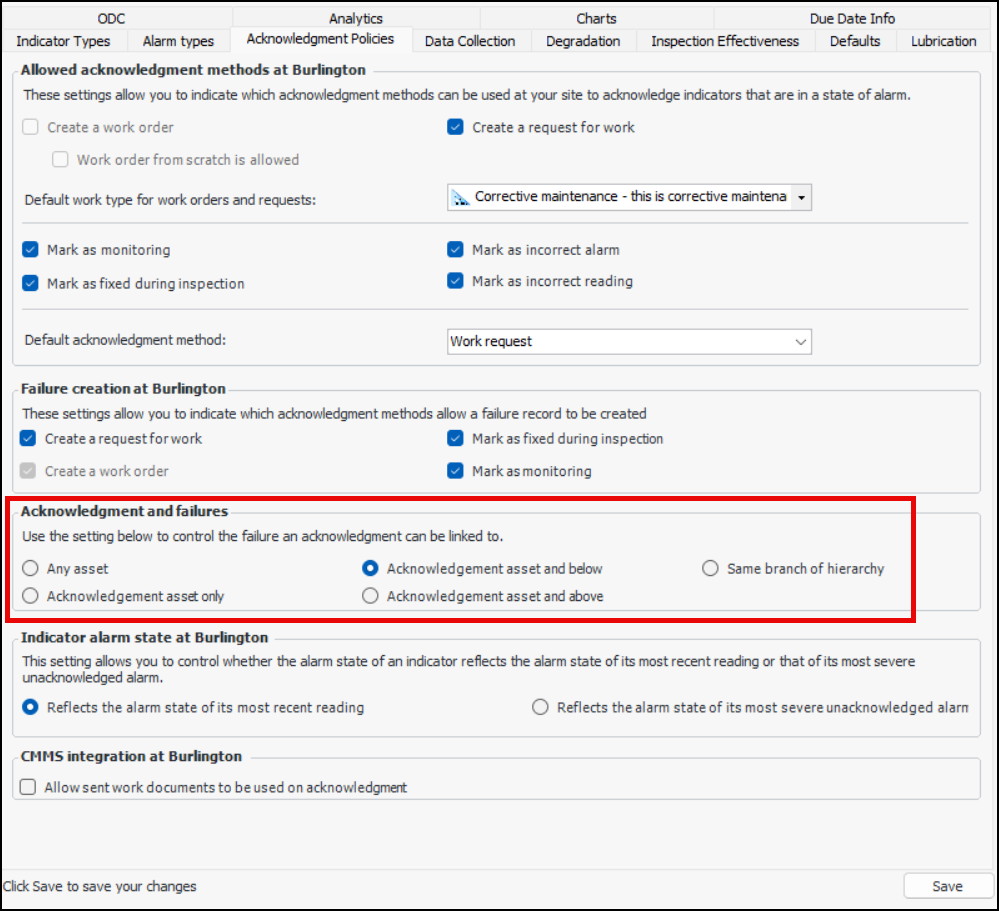 • Acknowledgment asset and above – Failures for acknowledgment’s asset and above in the hierarchy are availableTo set the option, open the Site window, select the Inspection Management view, Settings tab, Indicators tab, and Acknowledgment Policies tab. Click Edit to open the site for change.You will see the filtering in effect when you acknowledge an alarm, select the Failure tab and Link to existing failure. The Failure Selector dialog lists failures for assets as specified in the acknowledgment policy.Acknowledgment Windows Show Links to Work Documents