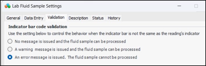When entering a fluid sample indicator reading, select the “sample taken” indicator state to view the Fluid Sample tab. You can now enter or scan the indicator bar code:Enter or scan the bar code and click OK. The bar code is added to the indicator and the fluid sample information.To set up APM to use indicator bar codes, update lab fluid sample settings. On the Data Entry tab, select the data entry policy for indicator bar codes on fluid samples:Select the Validation tab to select an option for indicator bar code validation.Inspection Management