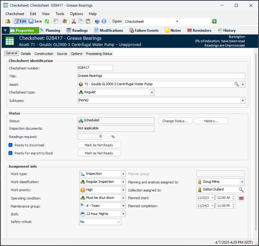 In the Checksheet window, the Properties view has been reorganized to make information easier to find. For example:The new Options tab contains settings for:Alarm Acknowledgments – Link to Failures