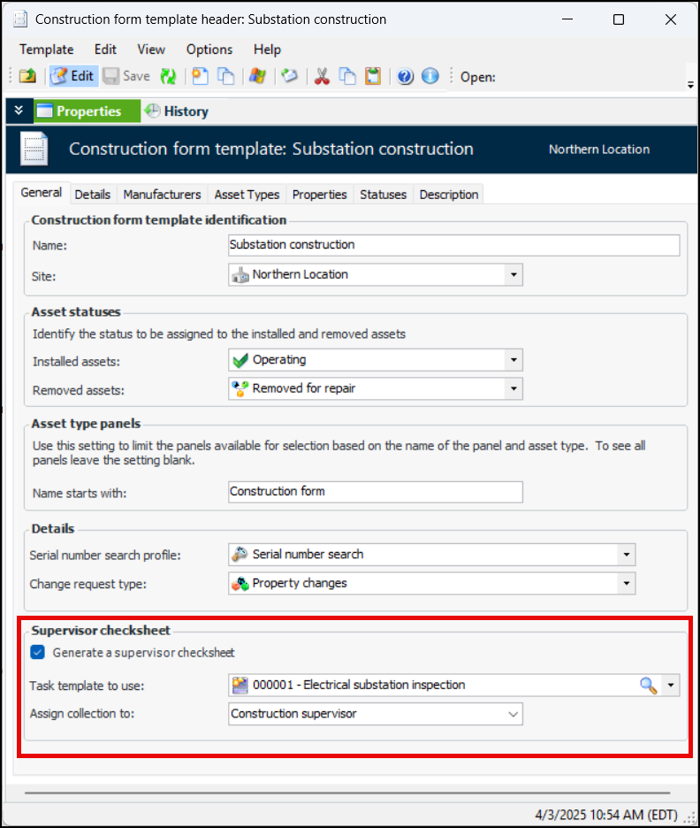To set up this functionality, open the construction form template. In the Construction Form Template Header window, select the Properties view and General tab. In the Supervisor checksheet area, select Generate a supervisor checksheet. Select a standard task template to use. If you wish, assign collection to the maintenance or construction supervisor on the construction form. For example:Construction form status properties now include an action for generating the supervisor checksheet and a rule that controls checksheet generation. For more information, see Setting up Statuses for Construction Forms.Adding Descendant Assets to Construction Forms