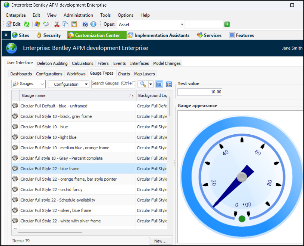All of the gauge appearances have changed in version 25.0.1. We recommend reviewing all of the gauges that you use and replacing them as required. In the Enterprise window, select the Customize Center view, User Interface tab, Gauge Types tab. Select a gauge in the table to view it in the Gauge appearance pane:Charts