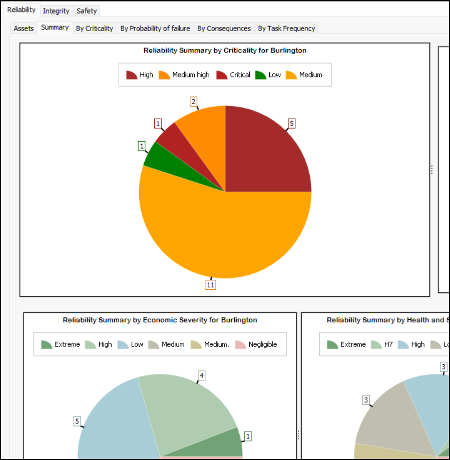 In the Hierarchy Risk and Asset Risk views in the Site window, you can now select the Summary tab to view reliability summary charts by:Each of the Reliability, Integrity, and Safety tabs contains a Summary tab. Here is an excerpt from the Site window’s Asset Risk view, Reliability tab, Summary tab:Note: Asset hierarchy risk summaries are “generally available” product features. You must first enable features 121 and 137 to use the functionality in APM. In the Enterprise window, select the Features view and the Enabled Features tab. Click Browse, select “Asset risk summaries” and “Asset hierarchy risk summaries”, and click OK. If APM is running as a smart client, click Refresh Enabled Features on the server. Then restart the client to use the functionality.Audit History