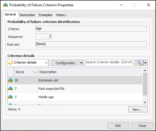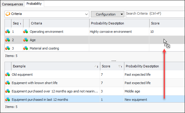Note: To use this functionality in APM, you must first enable feature 39. In the Enterprise window, select the Customization Center view and the Enabled Features tab. Click Browse, select “Criteria based probability evaluation on an asset prioritization analysis”, and click OK. If APM is running as a smart client, click Refresh Enabled Features on the server. Then restart the client to use the functionality.The probability analysis is designed to complement the consequence evaluation in prioritization analyses. On the Probability tab, select a criterion in the top table to display examples in the table below. Drag and drop the appropriate example to the criterion’s line to enter its score. For example:When you have completed the probability and consequence evaluations and click Calculate Scores, APM assigns the probability of failure and consequence priority to the analysis. The probability score is used in the calculation that determines relative risk.Setting up APM for Probability Analysis