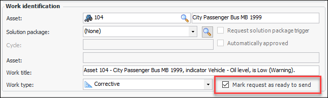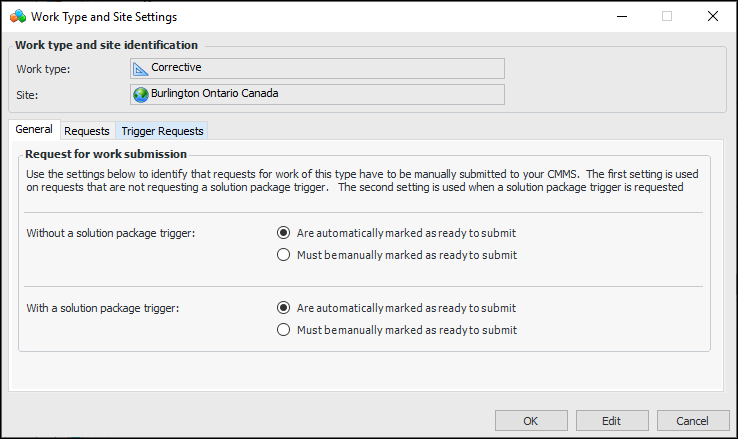 If Mark request as ready to send is not selected, the request must be submitted manually.The default value of Mark request as ready to send is controlled by the work type’s site settings. In the Work Type and Site Settings dialog, the General tab now provides options for two scenarios: when a solution package is selected for the request and when a solution package has not been selected. For both scenarios, the choice is between automatically and manually marking the request as ready to send.Requests for Work – Control Event Creation