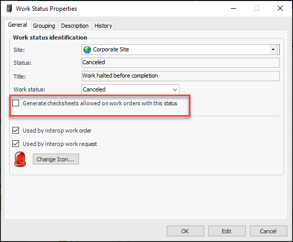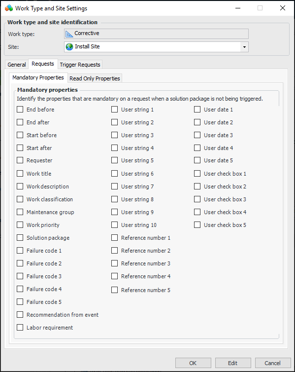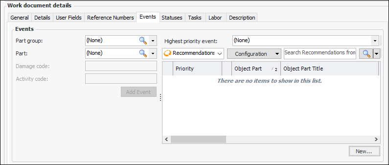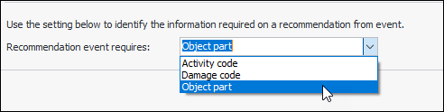 When you are adding an event to a request for work, the information you must supply in order to save the event is controlled by settings in the Site Interoperability Profile. The Recommendation event requires option specifies whether only the object part is required, damage code and object part are required, or activity code, damage code, and object part are required.In the Site Interoperability Profile Properties dialog, select the Work Management tab and the Failure Coding tab.AWEIS – Defining Properties on Interop Work Documents