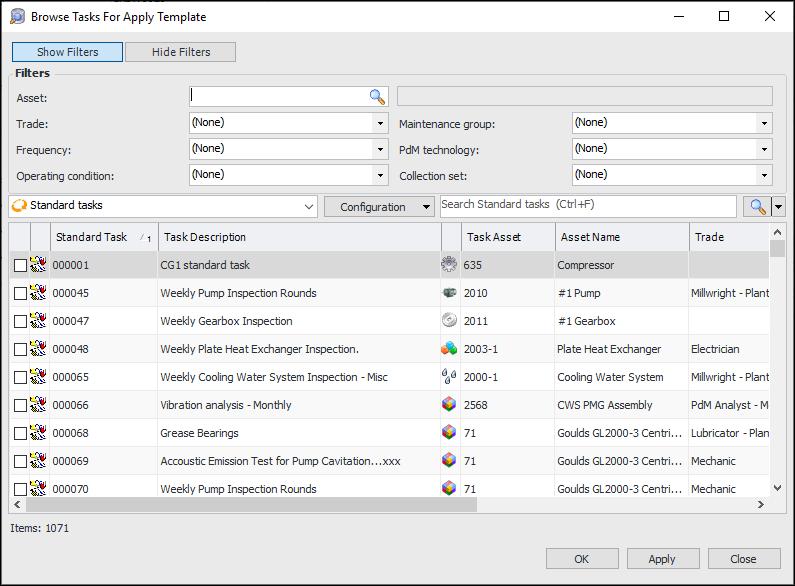 When creating a gas transaction that requires a value for Equipment decommissioned, you will notice that the default value is now null, rather than “Yes”. This means that you are required to select a value (yes, no) in order to save the transaction. This change prevents incorrect reporting of decommissioning events.Reliability Program – Apply Template to Multiple Tasks